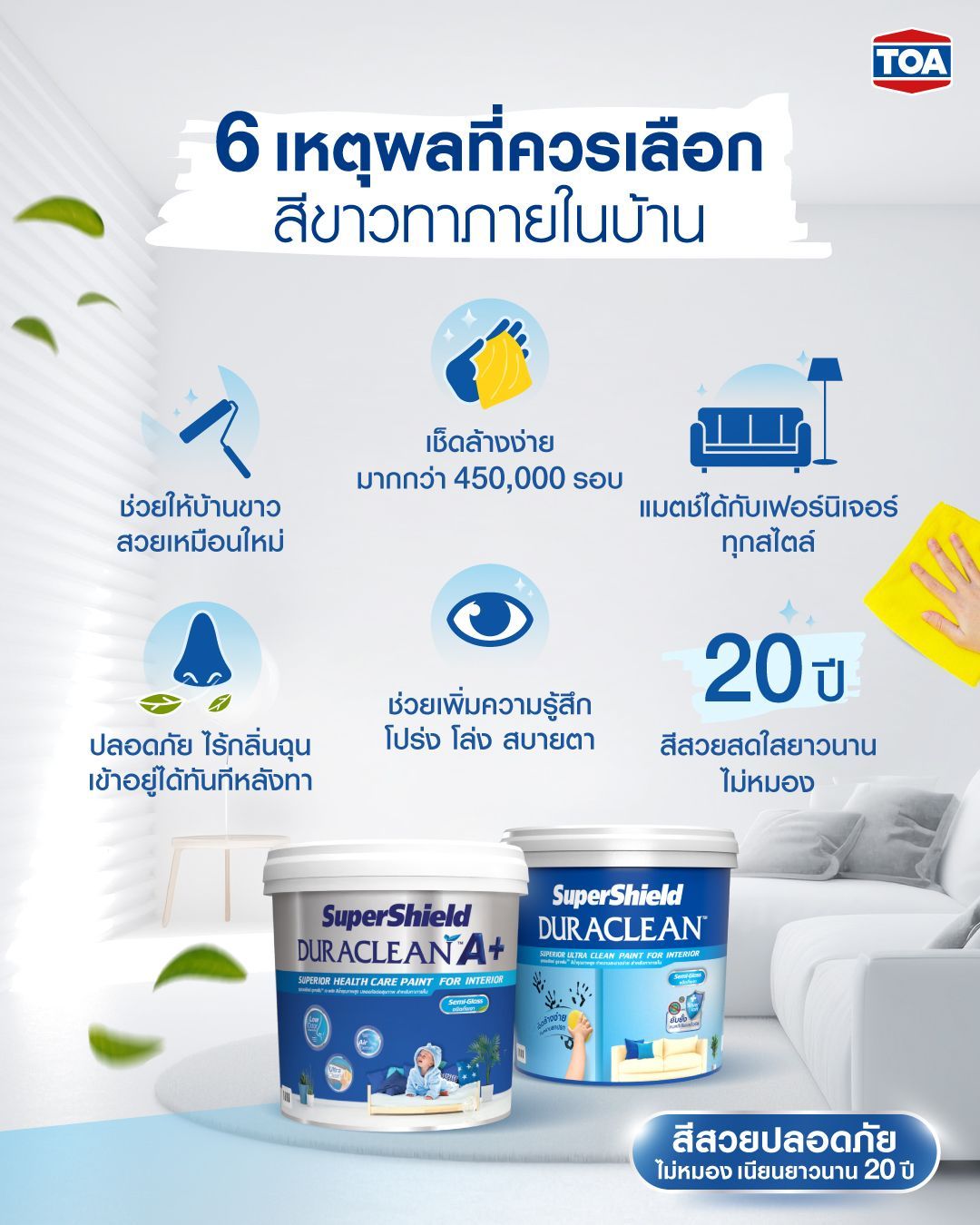สีขาวอาจดูเรียบง่าย แต่ถ้าเลือกผลิตภัณฑ์คุณภาพดีอย่าง SuperShield Duraclean A+ หรือ Duraclean มันไม่ใช่แค่ “ขาว” ที่สวย แต่ยัง “คุ้มค่า” ระยะยาวด้วย